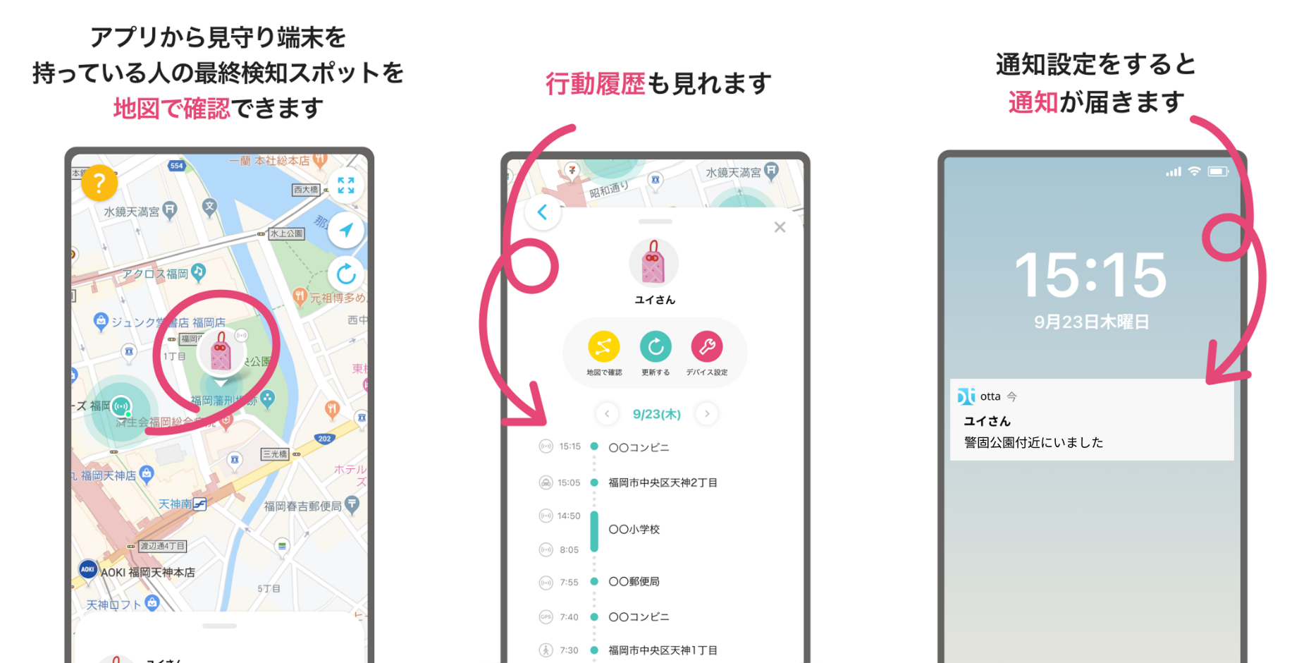 GPSのように常に追いかけるのではなく、通過したポイントを知らせる仕組みだから、見守られる人にとっても自然で負担の少ない見守りが実現します。